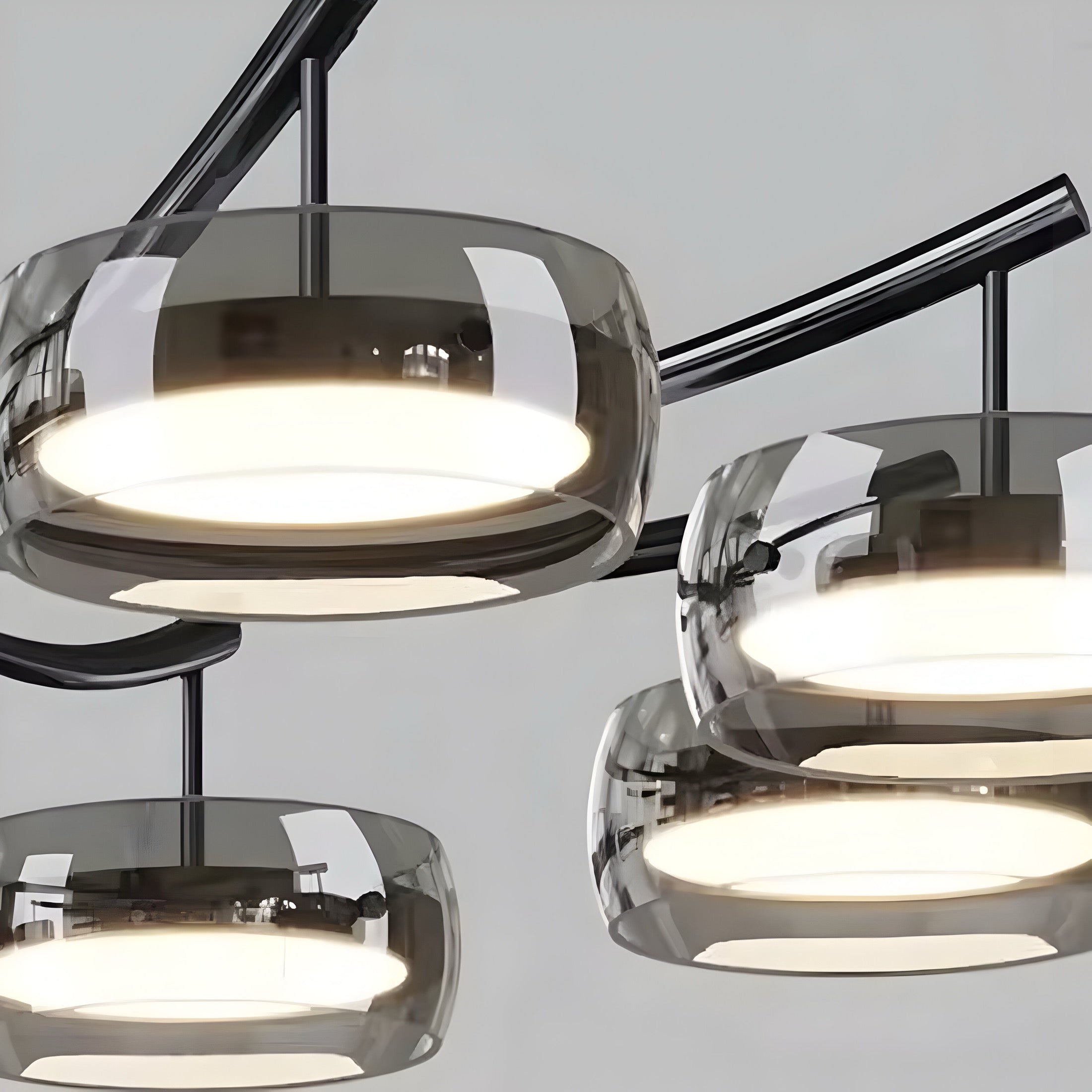 Brillantes Zusammenspiel: Wählen Sie zwischen brillantem Klarglas mit hochglänzenden Chrom-Akzenten für eine helle, luxuriöse Ästhetik oder geheimnisvollem Rauchglas mit mattschwarzen Details für einen Hauch von moderner Dramatik. Im Inneren jedes Glasschirms befindet sich das leuchtende Herzstück, das für eine blendfreie und faszinierende Illumination im ganzen Raum sorgt.