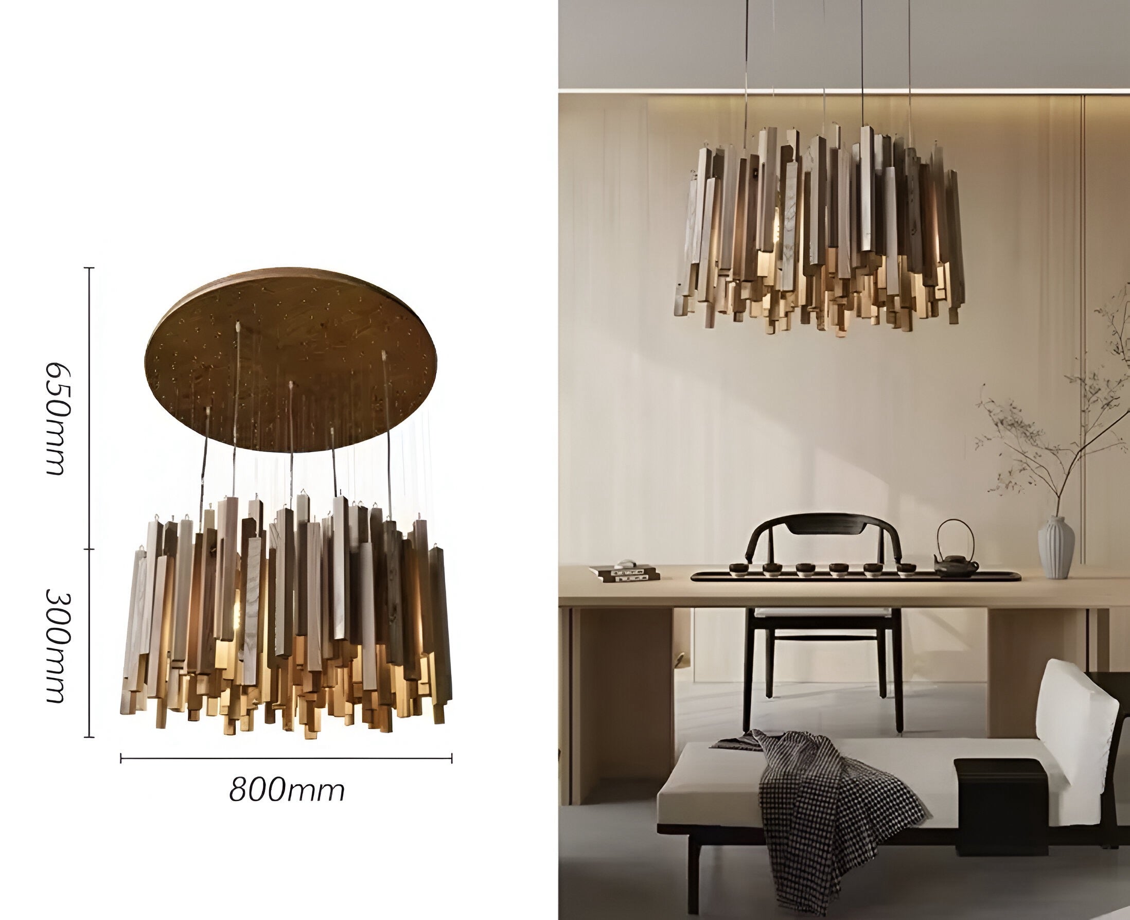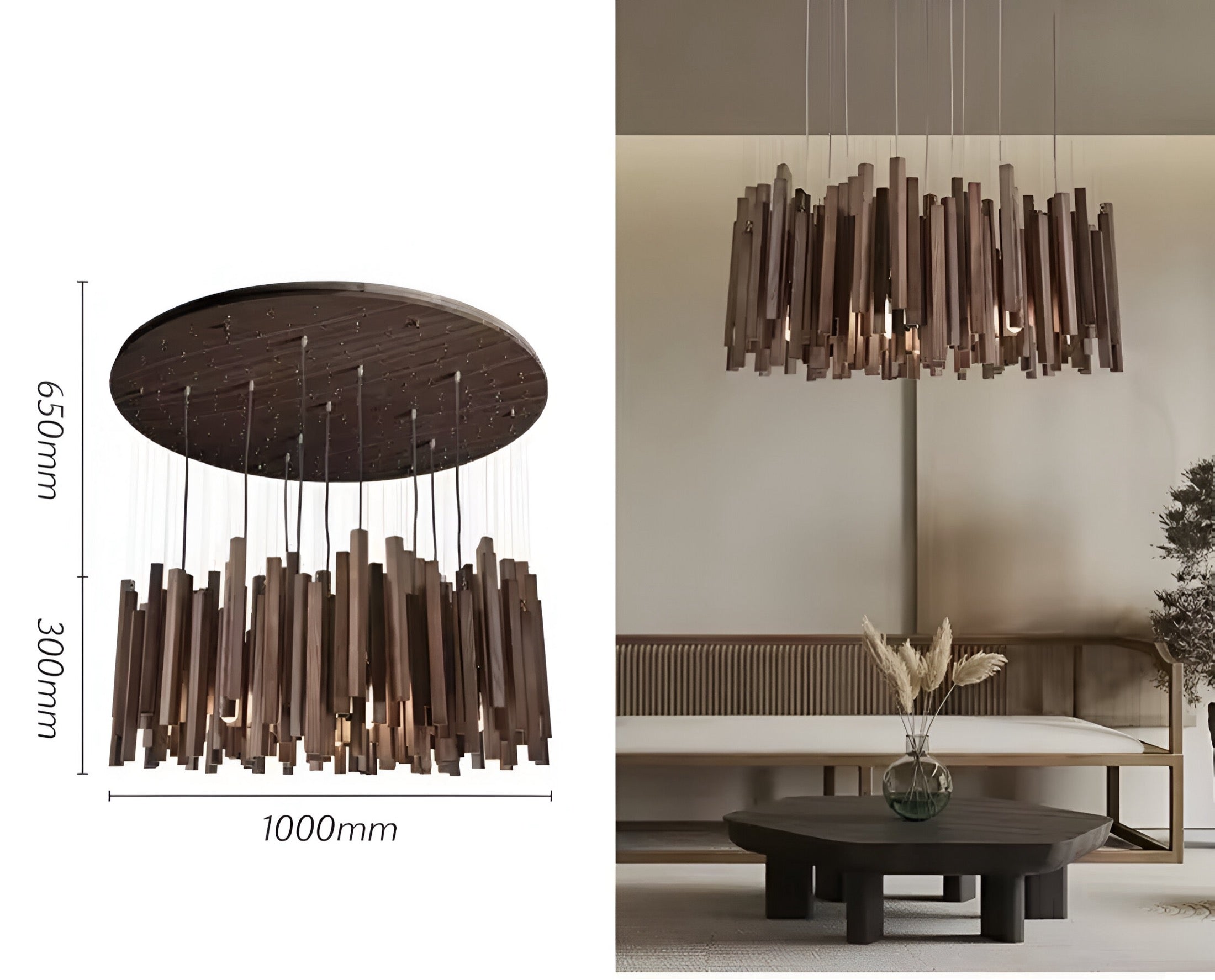 Die Designer Pendelleuchte Modern Yang zeichnet sich durch ihre massiven Holzelemente aus, die wahlweise in heller Eiche oder dunkler Walnuss ausgeführt sind. Diese hochwertigen Materialien verleihen der Leuchte eine warme, natürliche Ausstrahlung, die perfekt mit klaren, minimalistischen Formen harmoniert.