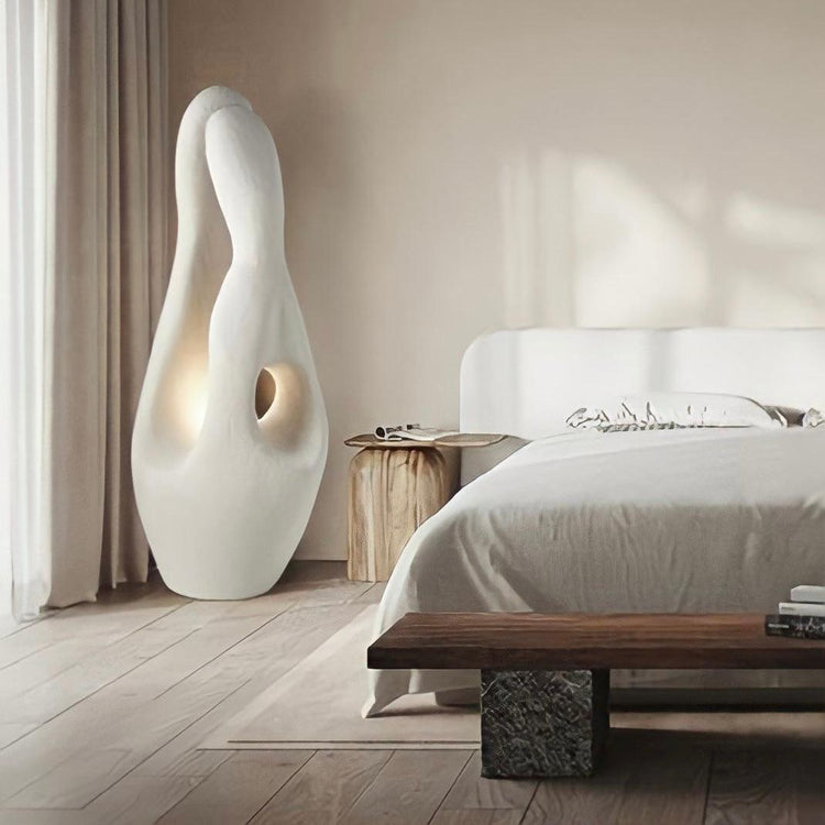 Le lampadaire Wabi-Sabi ne fait pas seulement bonne figure dans le salon, mais aussi dans la chambre à coucher.