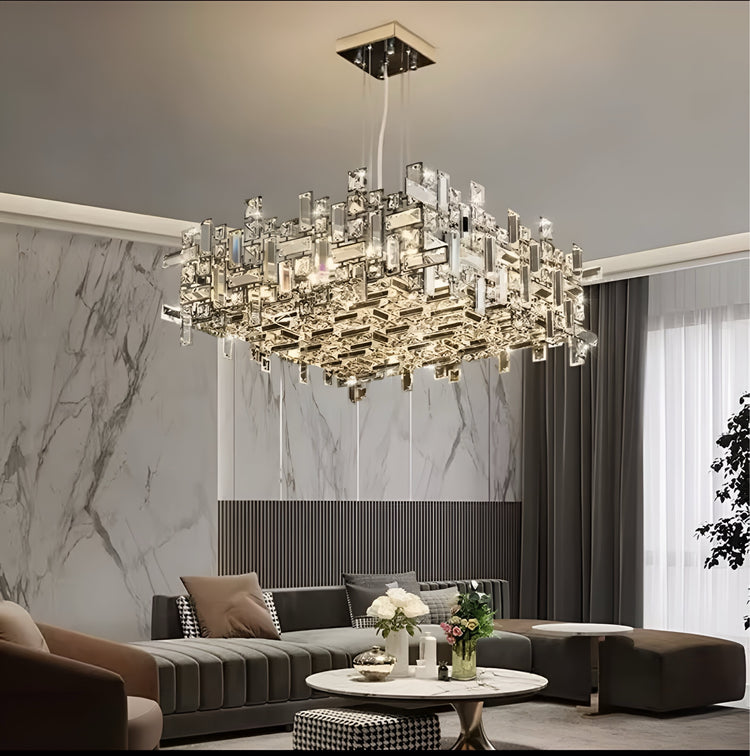 La suspension luminaire Cristallo Quadrato allie une élégance intemporelle et une technologie moderne dans un design exceptionnel. Sa forme carrée est ornée de nombreux bouquets de cristal K9 qui reflètent la lumière de manière fascinante tout en créant une atmosphère luxueuse.