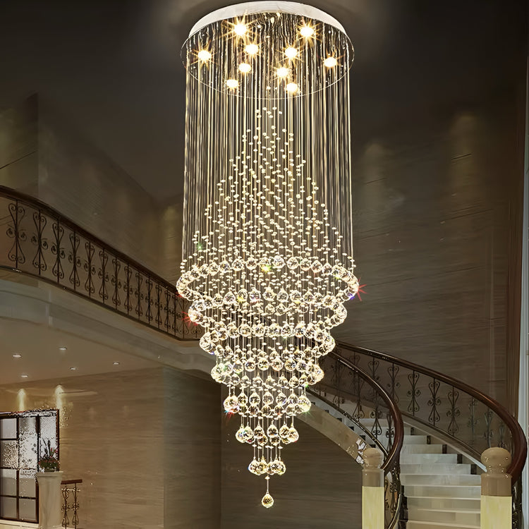 Les boules de cristal brillantes, disposées en plans de plus en plus étroits, créent un effet de chute d'eau captivant lorsque ces lignes délicates convergent.