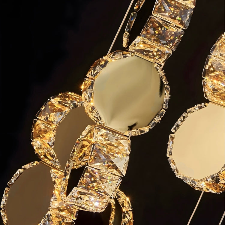 Ce lustre glamour baptisé Tamburo Diamanto fera rêver tes invités lors de leur prochaine visite . Ce lustre moderne diffuse une lumière douce et agréable pour une ambiance agréable dans le salon. Les éléments du lustre Tamburo Diamanto sont garnis de pierres de cristal K9 de haute qualité, taillées en forme de radiant. Les éléments suspendus sont en revanche en acier inoxydable dont la surface a été traitée et qui brille d'un ton doré pompeux.