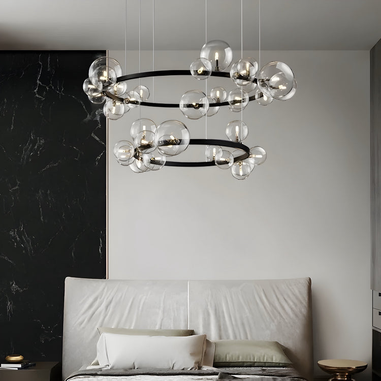 La suspension luminaire est composée d'éléments en verre sphérique qui se fondent sans transition dans le corps de la lampe.