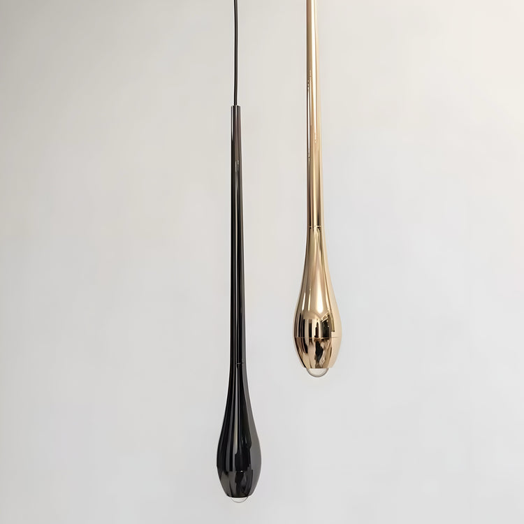 Gocce di metallo liquido: ogni singolo ciondolo è realizzato in alluminio lucidato a specchio, come una sottile goccia dalla forma organica. Si può scegliere tra l'intramontabile argento (look cromato), l'opulento oro o il nero profondo ed elegante. La sorgente luminosa a LED integrata si trova nella parte superiore di ogni goccia, creando un accento brillante e luminoso e facendo brillare il metallo.