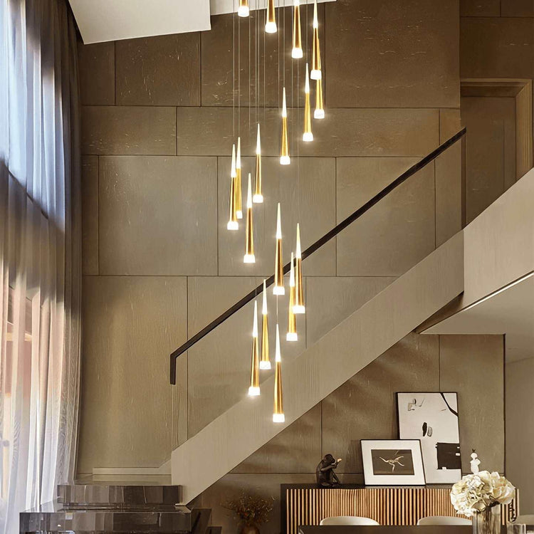 Il lampadario Cornet duplex è ideale per ambienti con soffitti alti, ma può essere utilizzato anche come illuminazione da tavolo con un numero di elementi proporzionalmente inferiore.